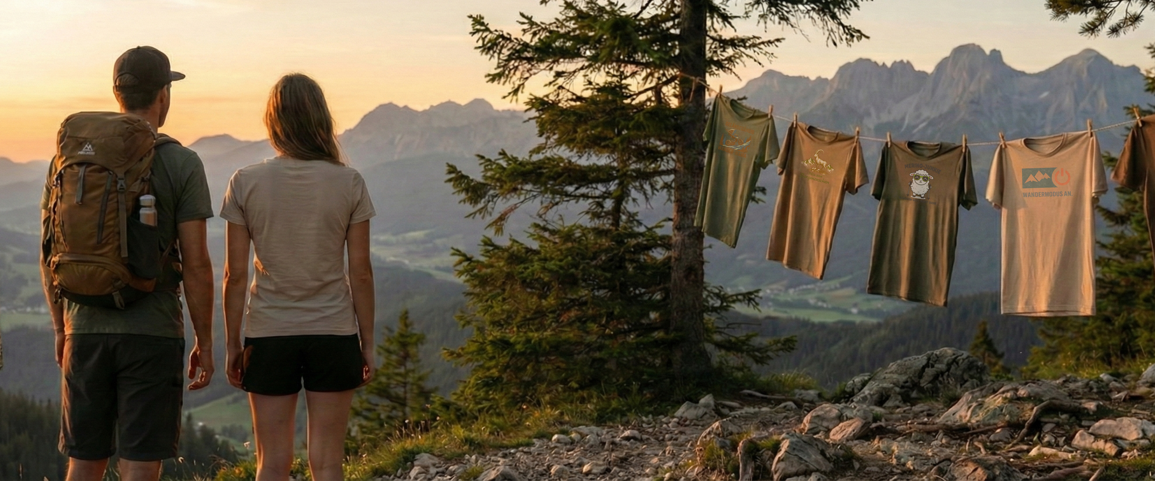 Bei uns gibt's kein verstaubtes Lagerregal voller T-Shirts, die auf bessere Zeiten warten. Jedes Shirt wird erst bedruckt, wenn du auf „Bestellen" klickst – frisch wie Bergluft und gut fürs Klima. So vermeiden wir Textilmüll und produzieren nur, was wirklich gebraucht wird.